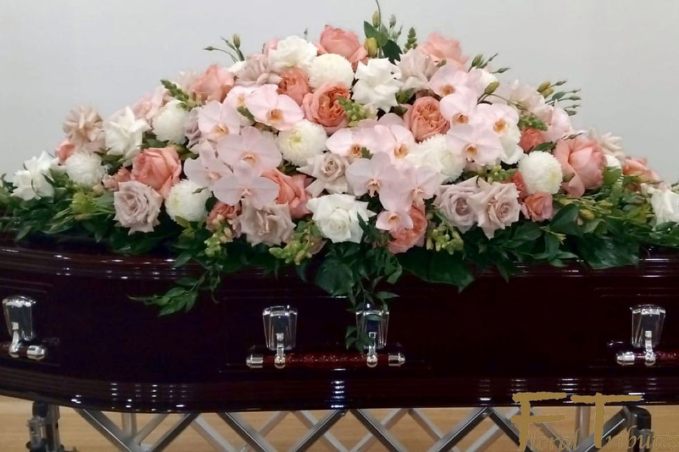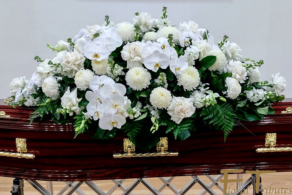 Casket covers, also known as casket sprays or coffin covers, are floral arrangements specifically designed to adorn the casket or coffin during a funeral or memorial service. These arrangements are typically larger and more elaborate, serving as a focal point of the funeral display. Casket covers are meticulously crafted with beautiful flowers and greenery to pay tribute to the deceased and create a dignified and serene atmosphere. It is important to note that casket covers should be delivered directly to the funeral director or the funeral home handling the arrangements.